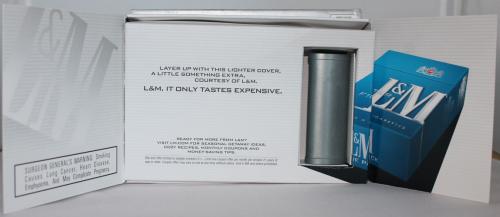 Direct mail gift received in February 2013 of a silver lighter cover in an unfolding box. Text: "Here's what the snappiest lighters will be sporting this season."