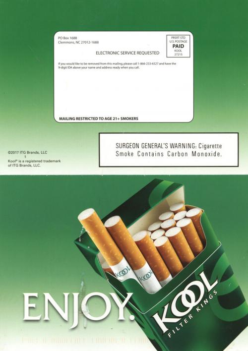 Direct mail from KOOL in May 2017 with the copy, "It's your time. ENJOY." and providing a customer ID# for the recipient to register with on the brand website. Includes coupons. Imagery is of a multi-ethnic group of men and women around a table.