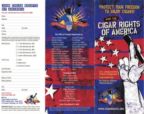 Brochure for the Cigar Rights of America complete with a membership form, information about the cause, and industry supporters. Directs the reader to their website to find out more. Text: "Fighting to protect your freedom to enjoy cigars!"