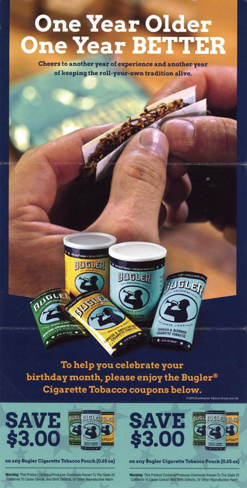 Direct mail from Bugler in June 2017 wishing the recipient a happy birthday. Coupons are included to help celebrate the month. Reminds the recipient to register on the brand website. Text: "One year older, one year BETTER. Cheers to another year of experience and another year of keeping the roll-your-own tradition alive."