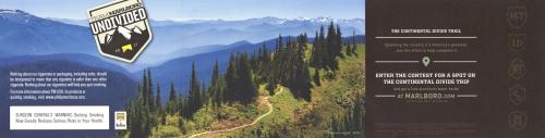 Direct mail from Team Marlboro promoting the Undivided contest about the Continental Divide trail efforts. Invites the recipient to enter on the brand website and receive a complimentary water bottle. Includes imagery of epic mountain landscapes and a coupon. Text: "One team. One trail. One legacy."
