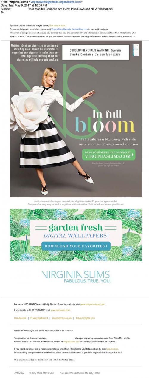 Virginia Slims email from May 2017 with an invitation to claim coupons and download digital wallpapers on the brand website. Also mentions style inspiration and encourages the recipient to "browse around." Text: "In full bloom"