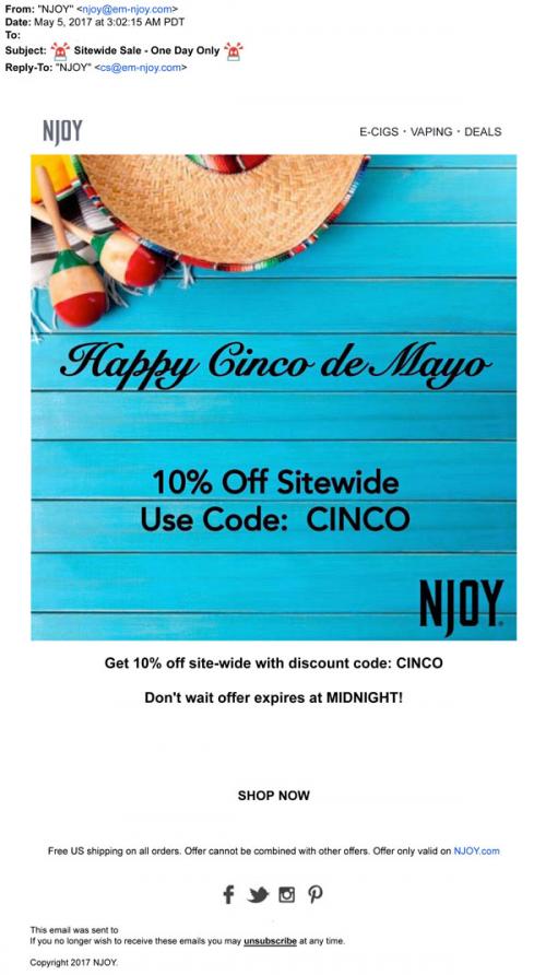 Cinco de Mayo email from NJOY in May 2017 with a code to get discounts on purchases made through the brand website for the holiday.