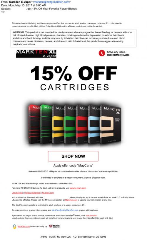 Mark Ten email from May 2017 announcing a sale on cartridges.
