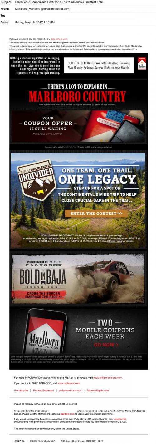 Marlboro email from May 2017 reminding the recipient to claim coupons on the