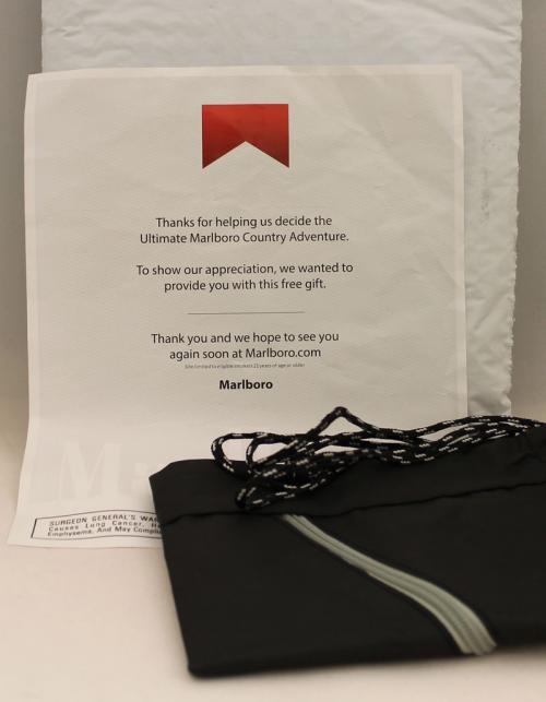 As thanks for participating in the Ultimate Marlboro Country Adventure, Marlboro sent this bag in May 2017. It arrived in a white mailer with a card insert that thanks the recipient and invites them to the brand website.