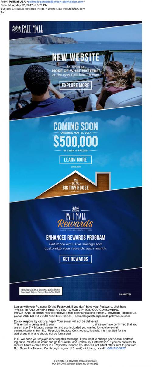 Pall Mall email from May 2017 promoting the new brand website design and the upcoming Big Tiny House sweepstakes. Also invites the recipient to claim their monthly coupons on the site.
