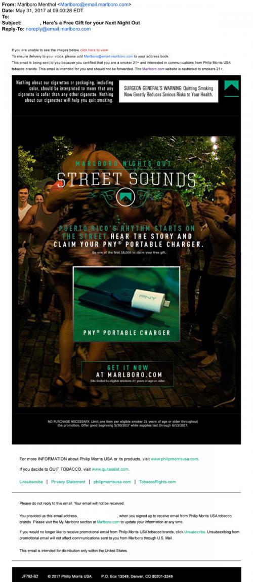 Marlboro Menthol email from May 2017 offering a free gift of a portable phone charger when you check out the Street Sounds feature on the brand website.