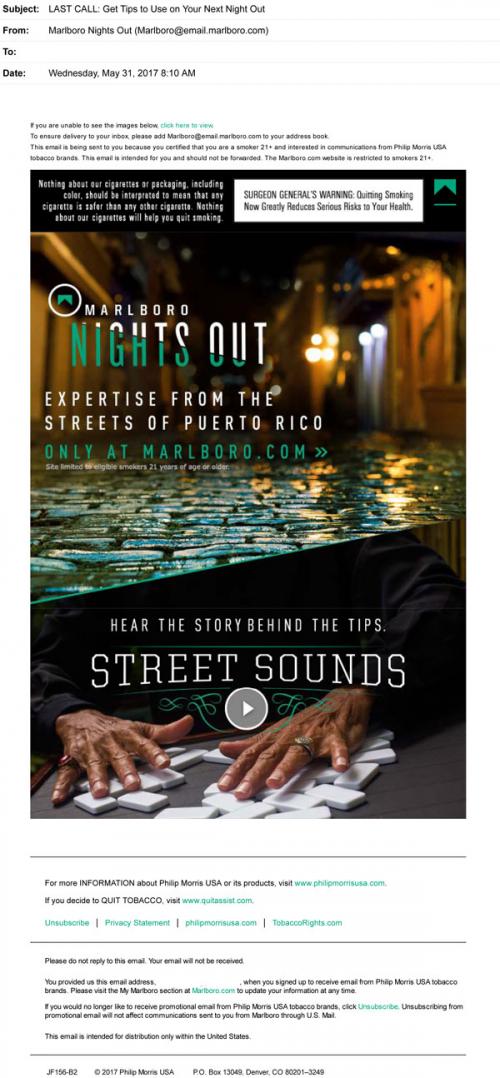 Marlboro Menthol email from May 2017inviting the recipient to check out some Nights Out features on the brand website: nightlife tips for Puerto Rico, and the Street Sounds feature.