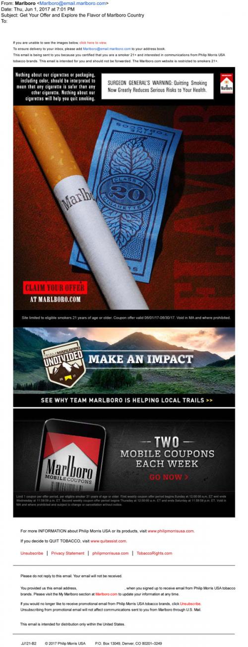 Marlboro email from June 2017 linking the recipient to claim the monthly coupon offer on the brand website. Also promotes the Team Marlboro Undivided contest, with a background look at local trails, and reminds the recipient that extra weekly coupons can be claimed from the site with a mobile device.