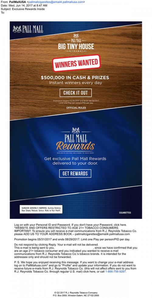 Pall Mall email from June 2017 promoting the Big Tiny House sweepstakes. Also links to the brand website to claim monthly coupons.