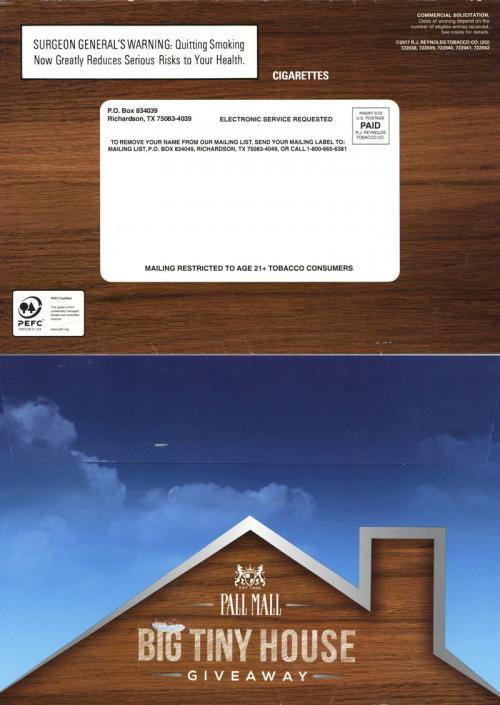 Direct mail received in June 2017 promoting Pall Mall's Big Tiny House giveaway. Half of the mailing is in the shape of a house and describes the giveaway, while the other half contains coupons and advertises the brand website for additional offers.