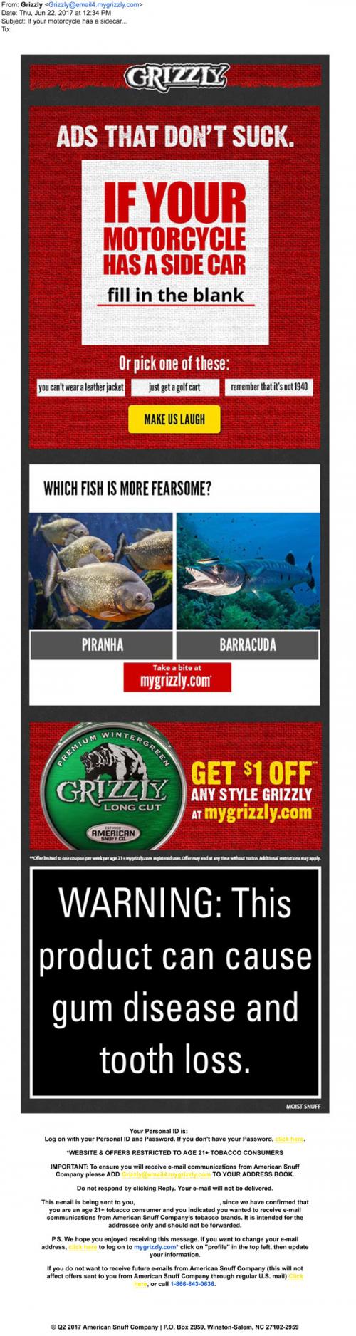 Grizzly email from June 2017 soliciting for more "Ads that don't suck." Also asks for people to vote on fearsome fish on the brand website and reminds the recipient to claim a coupon.