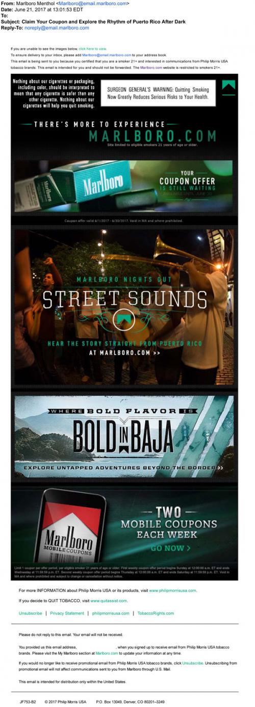 Marlboro Menthol email from June 2017 with a reminder to claim coupons on the brand website, and weekly coupons on a mobile phone as well. Links to a Marlboro Nights Out feature on Puerto Rican nightlife. Also links to a