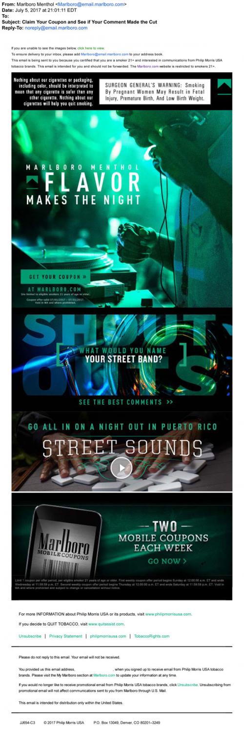 Email from Marlboro Menthol in July 2017 providing a link to the brand website to claim a coupon, with a reminder to claim extra weekly coupons via mobile phone. Also links to features like Street Sounds, about Puerto Rican nightlife, and the best comments from an interactive question asking what you'd name your street band.