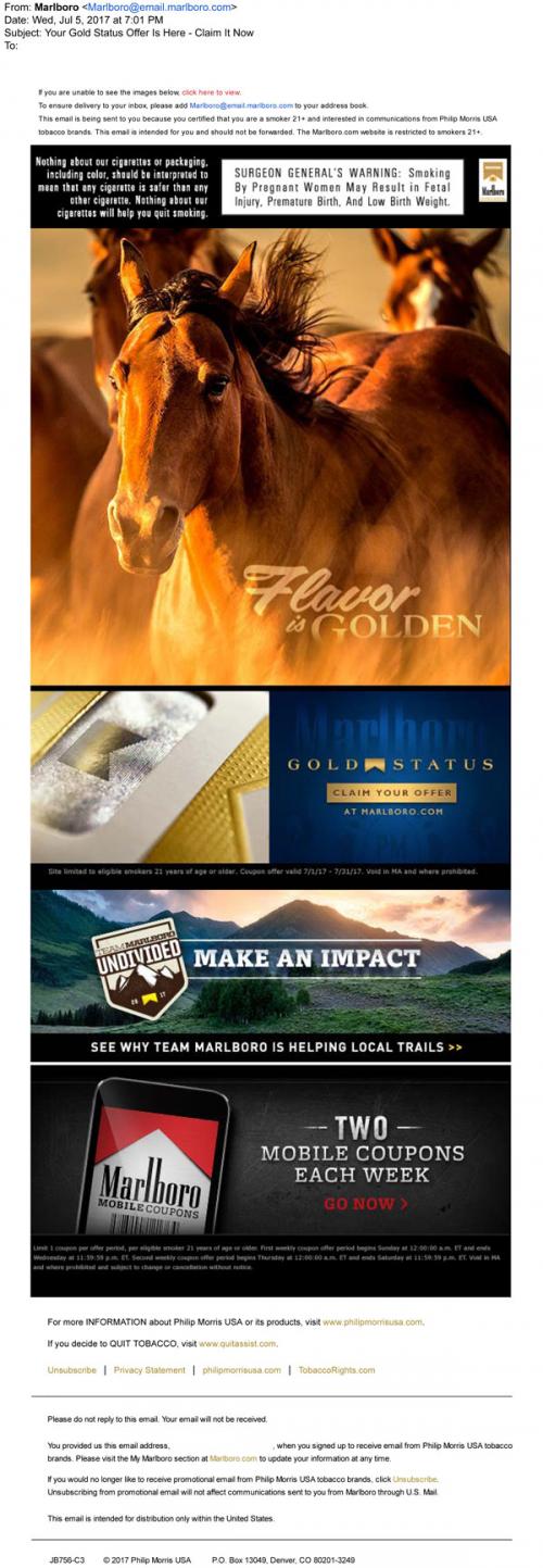 Marlboro Gold email from July 2017 linking to claim coupons on the brand website; also reminds the recipient to claim weekly coupons with a mobile device. Links to learn more about the Team Marlboro Undivided trail project as well.