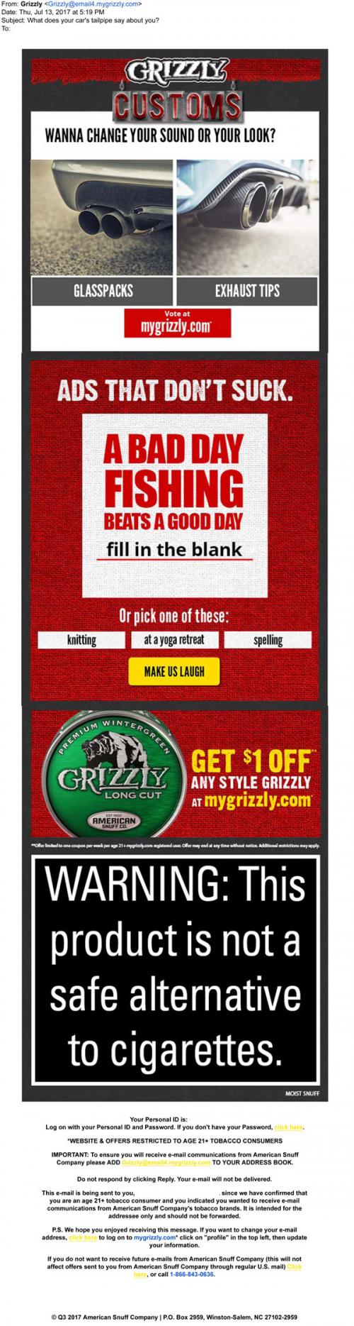 Email from Grizzly in July 2017 linking to a "tellin' it like it is" discussion about car parts and an invite to create "ads that don't suck" on the brand website. Also reminds the recipient to claim a weekly coupon.