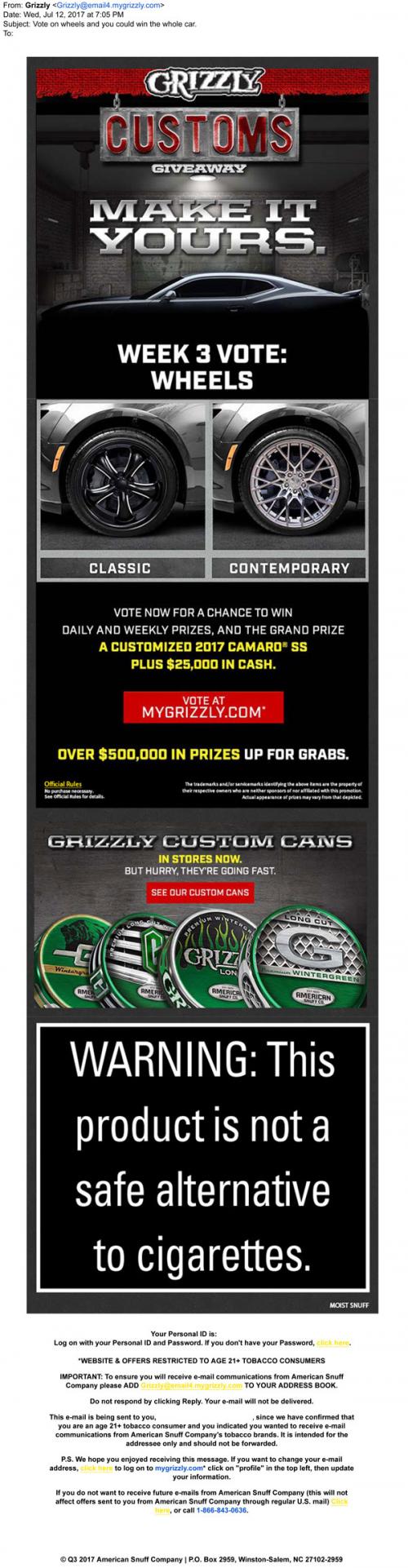 Grizzly email from July 2017 promoting the Customs giveaway, linking to the weekly vote on the brand website. Also features images of the limited custom cans, available in stores.