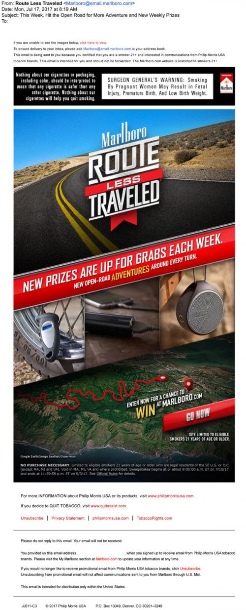 Marlboro email promoting the Route Less Traveled sweepstakes in July 2017. Shows the lineup of prizes available for the week and links to the brand website to enter.