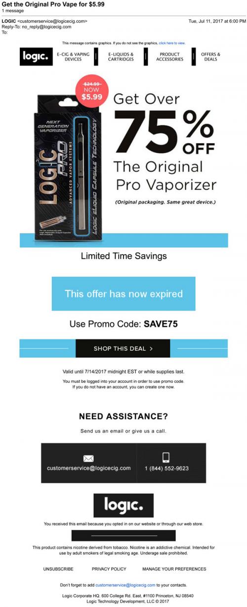 Logic email from July 2017 promoting the sale on their pro vaporizers for a limited time.