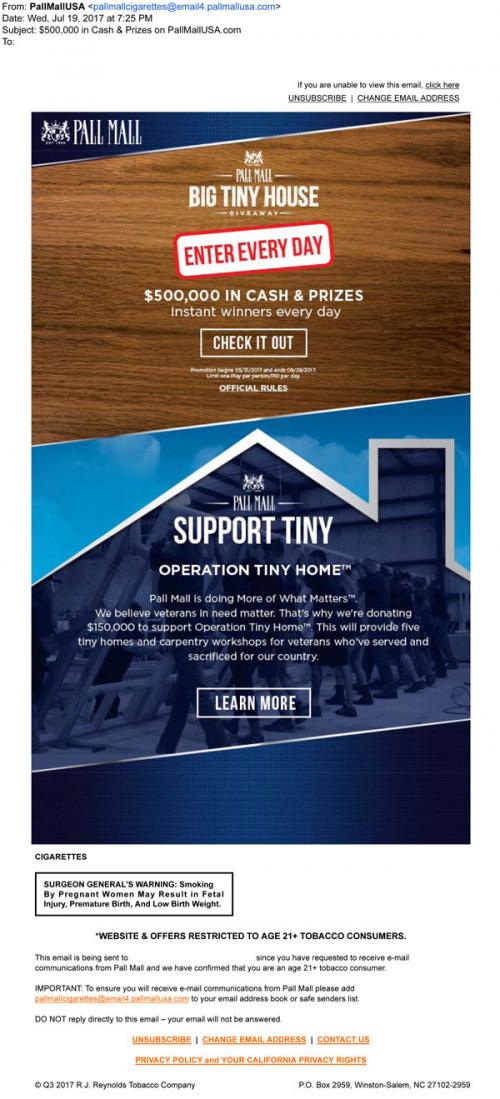 Pall Mall email from July 2017 promoting the Big Tiny House giveaway, with a link to the brand website to enter. Also features a link to learn more about how the brand is helping veterans through donations to a tiny home project.
