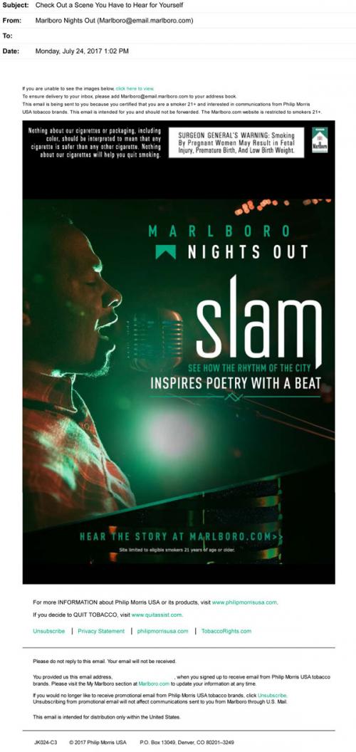 Marlboro Menthol email from July 2017 with a feature on slam poetry, linking to the story at the brand website.