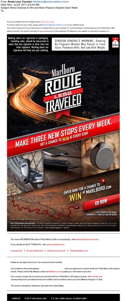 Marlboro email from July 2017 promoting the Route Less Traveled sweepstakes, with a link to the brand website to enter.