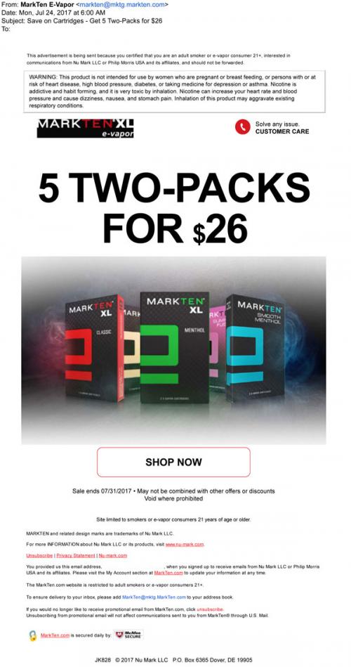 Email from MarkTen in July 2017 promoting a sale on cartridge packs, with a focus on the menthol products.