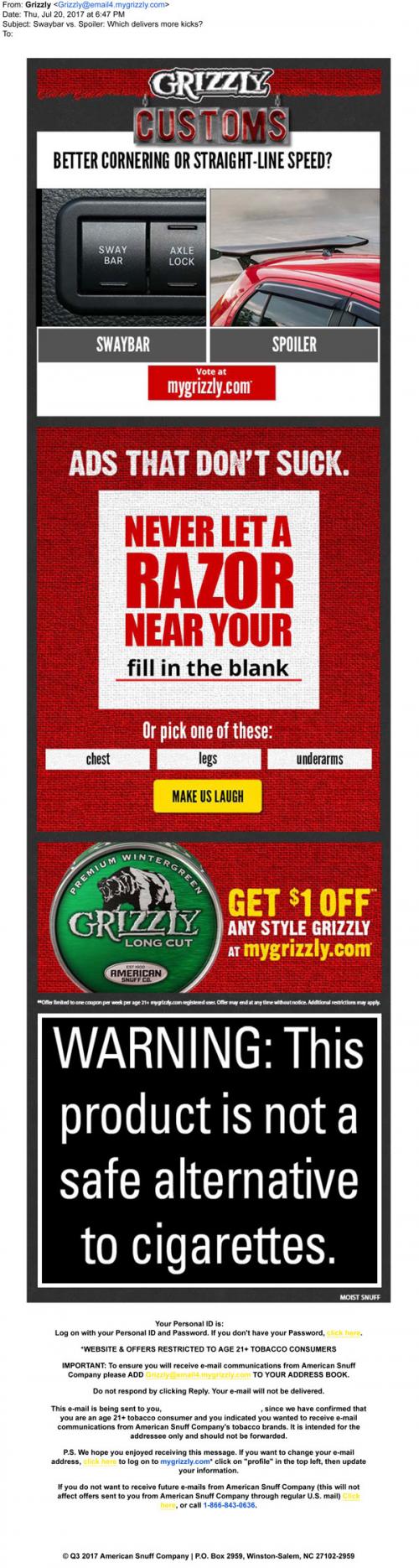 Email from Grizzly in July 2017 inviting the recipient to interact with others on the brand website, by discussing car mods and to submit "ads that don't suck." Includes a reminder to claim a coupon.