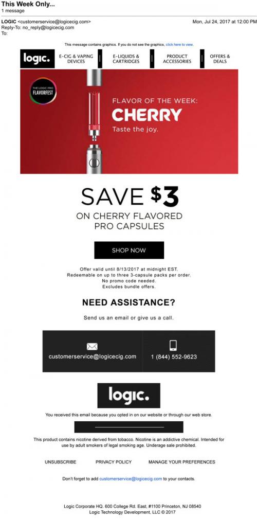 Email from Logic in July 2017 promoting a sale on cherry flavored e-cig capsules purchased through their online store; links to the brand website to purchase.