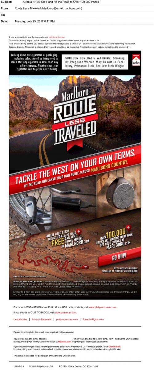 Email from Marlboro in July 2017 to promote the Route Less Traveled sweepstakes, with a preview of possible prizes, the offer of a free car phone mount for participating, and a link to the brand website to enter.