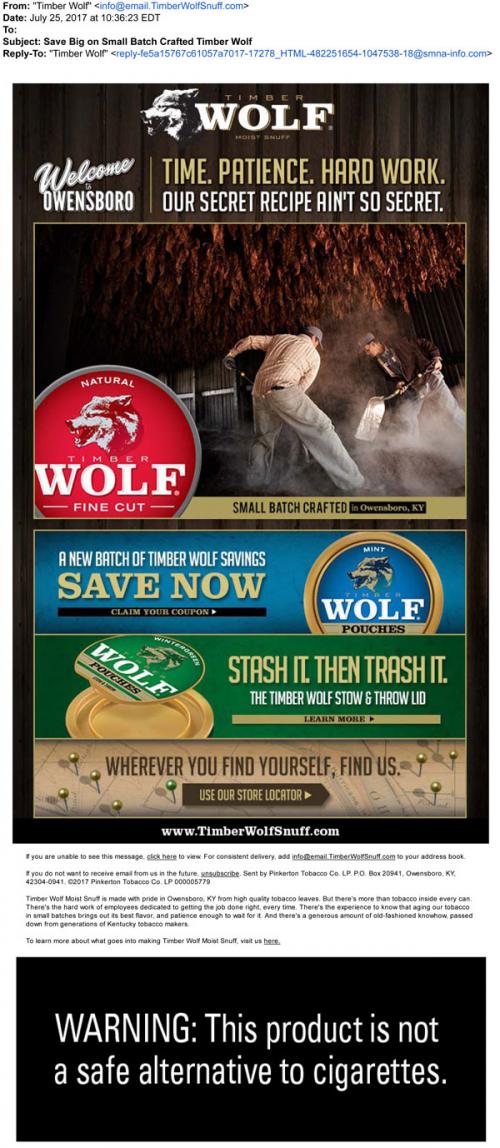 Email from Timber Wolf in July 2017 linking to claim coupons on the brand website. Also links to learn more about product features and to find nearby retail locations on the store locator.