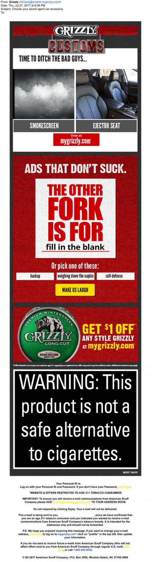 Email from Grizzly in July 2017 inviting discussion on the brand website about spy cars and asking for input on "ads that don't suck." Also reminds the recipient to claim a weekly coupon.