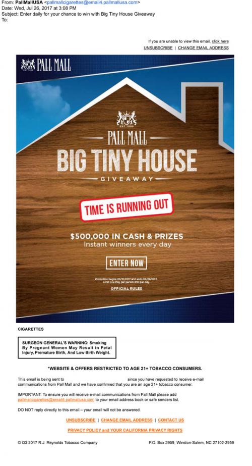 Email from Pall Mall in July 2017 promoting the Big Tiny House giveaway, reminding the recipient to enter daily before the sweepstakes ends.