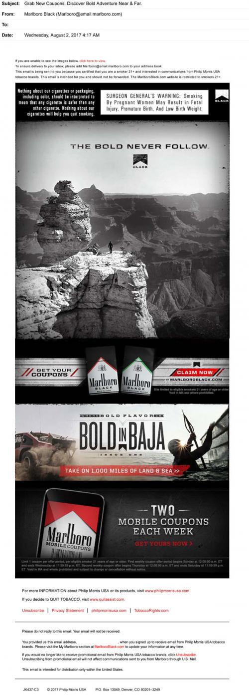 Email from Marlboro Black in August 2017, linking to claim coupons on the brand website. Also links to check out the Bold in Baja feature, and reminds the recipient to claim weekly mobile coupons with their phone or other device.