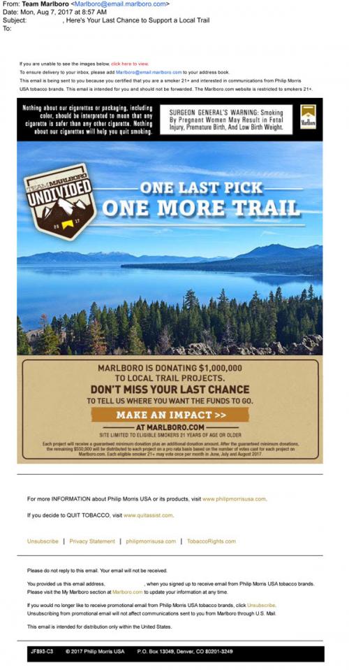 Email from August 2017 for the Team Marlboro Undivided project, inviting the recipient to choose one more trail to receive a donation from the brand. Links to the brand website.
