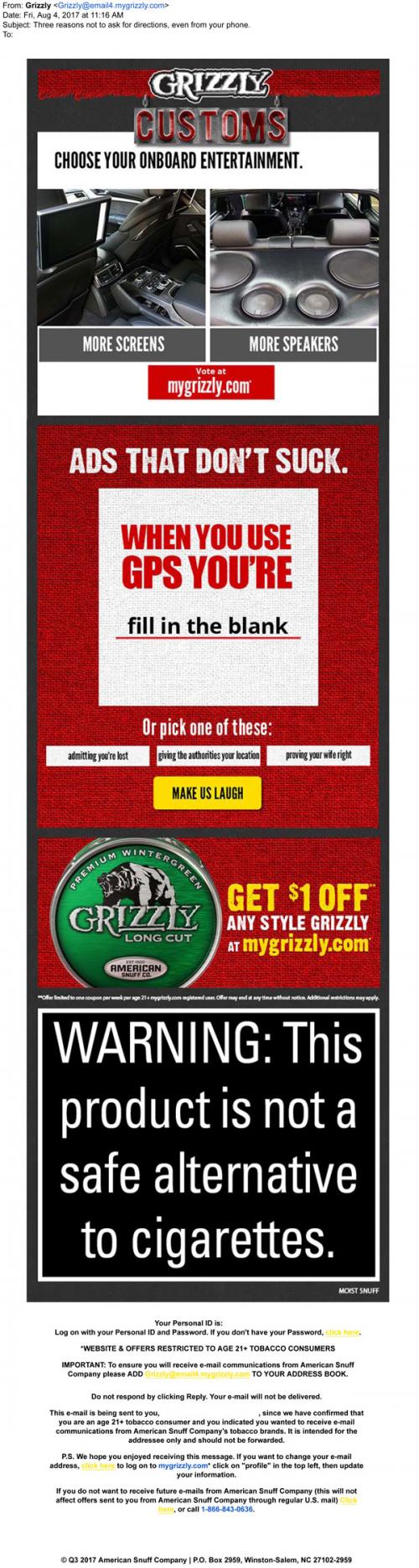 Grizzly email in August 2017 that links to interactive discussions on the brand website about car mods and a chance to contribute "ads that don't suck." Also reminds the recipient that weekly coupons are available to claim.
