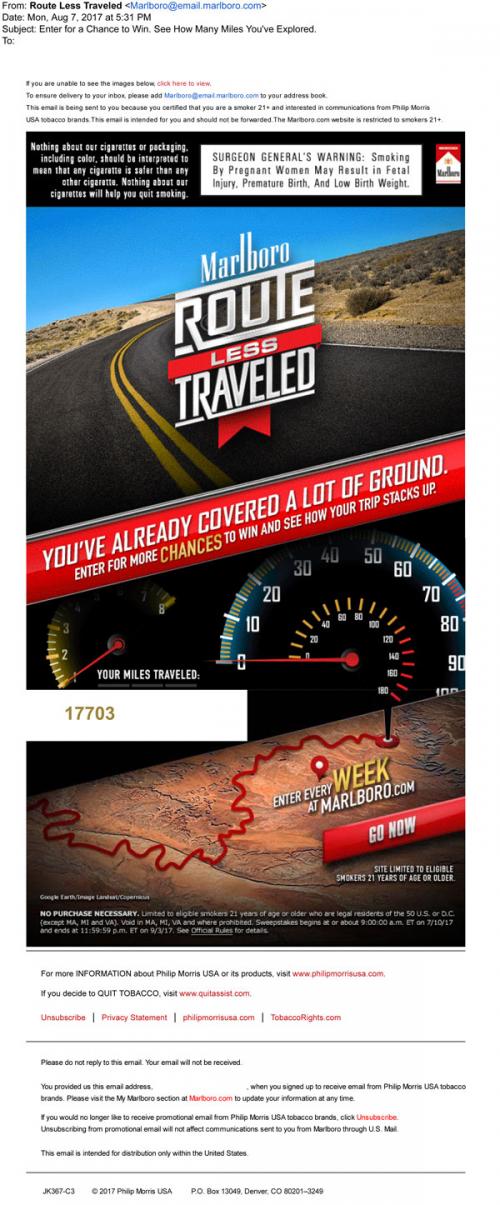 Email from Marlboro in August 2017 to promote the Route Less Traveled sweepstakes, with an update for the participant of their progress. Includes a link to the brand website to enter.