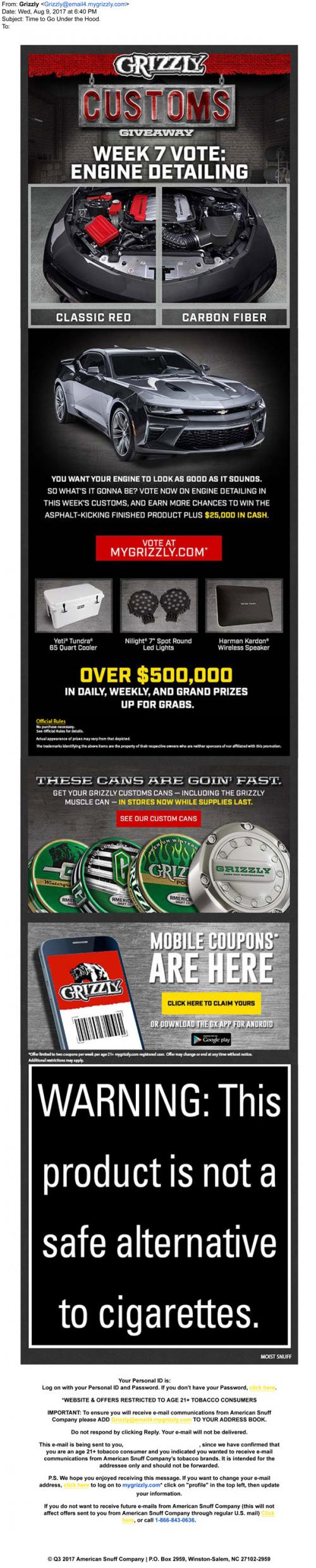 Grizzly email from August 2017 promoting the Customs giveaway, with a link to the brand website to enter and a preview of available prizes. Also features images of the limited availability cans that can be bought in store to tie in with the giveaway, and promotes the new mobile coupon program.