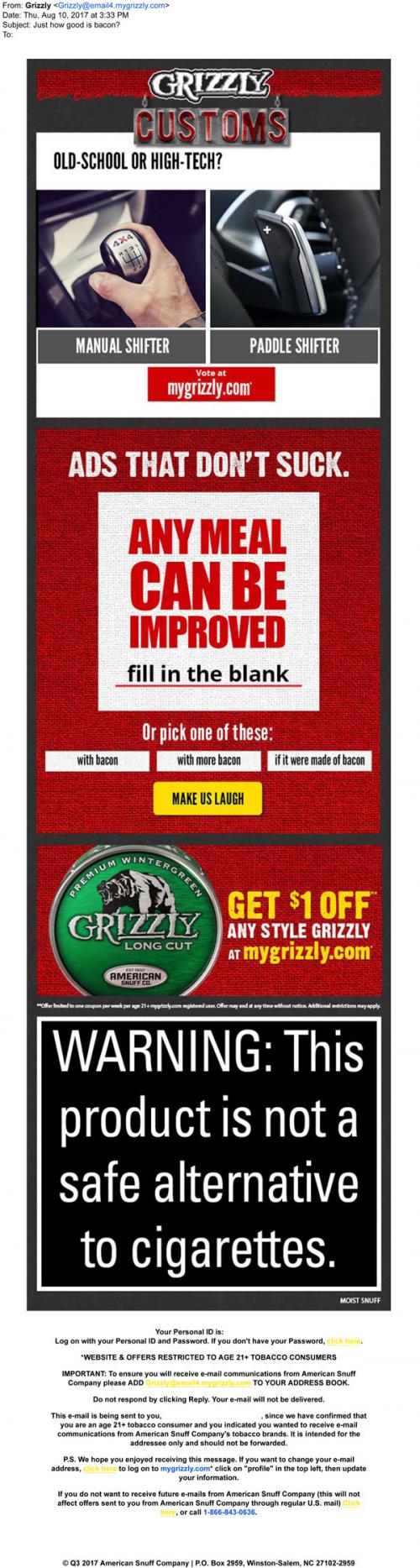 Email from Grizzly in August 2017 inviting the recipient to interact with opinion polls and to create "ads that don't suck" on the brand website. Also includes a reminder and link to claim coupons.