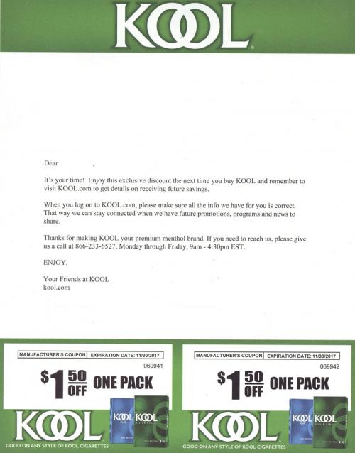 Direct mail from KOOL received in August 2017 delivering coupons. Reminds the recipient to check the brand website for more information on future savings. Image shows a multi-ethnic group of people playing cards.