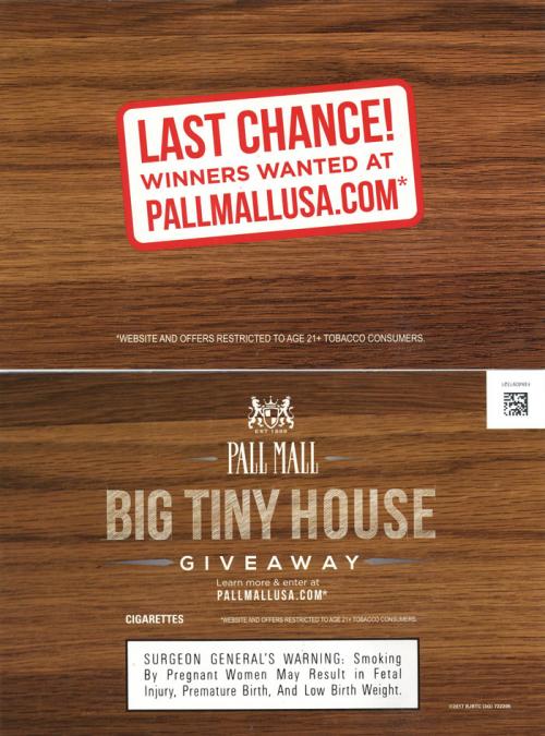 Direct mail from Pall Mall received in August 2017 reminding the recipient of their last chance to enter the Big Tiny House giveaway. The piece has a pop-up house design on the inside that describes the prizes and rules of entering, directing the recipient to enter on the brand website.