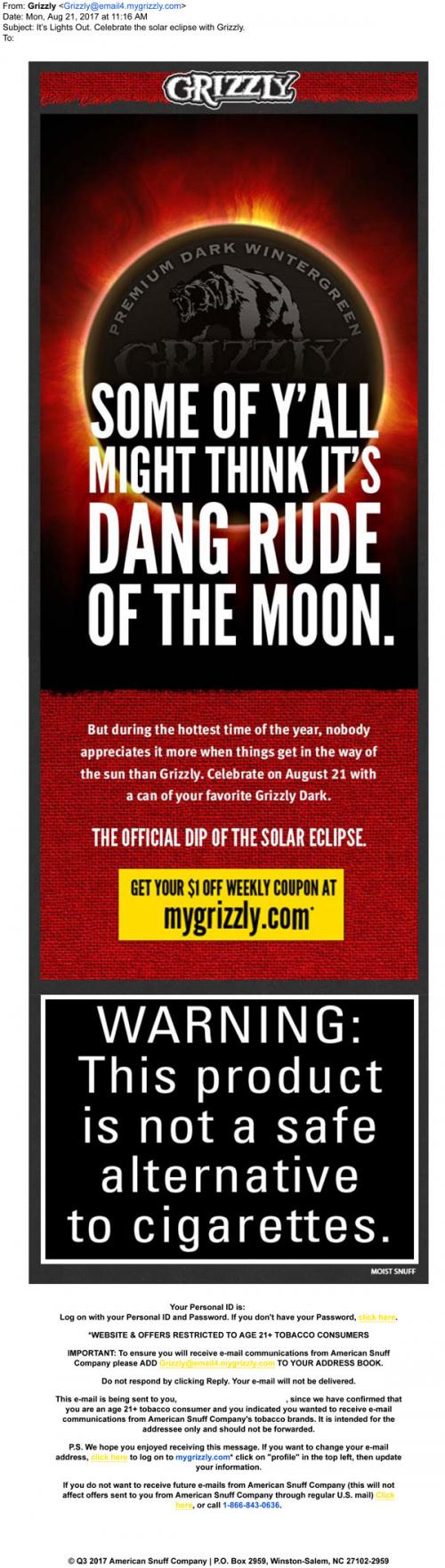 Grizzly email from August 2017 inviting the recipient to celebrate the solar eclipse with the "official dip," Grizzly Dark. Also links to the brand website to claim a weekly coupon.