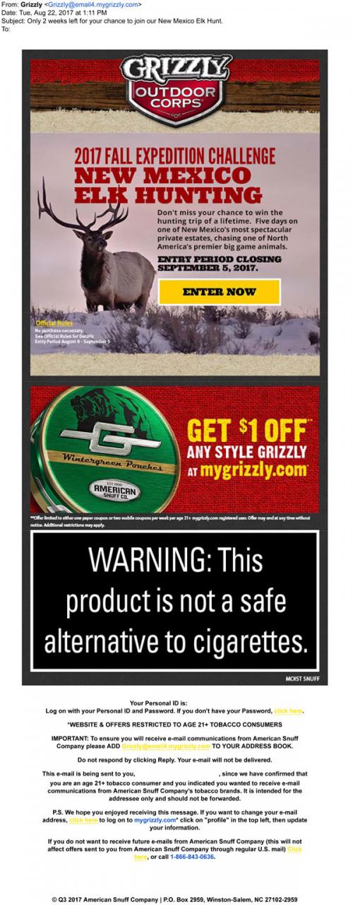 Email from Grizzly in August 2017 promoting a chance to win an elk hunt in New Mexico; links to the brand website to take a hunting quiz to quality and enter. Also reminds the recipient to claim a coupon for the week.