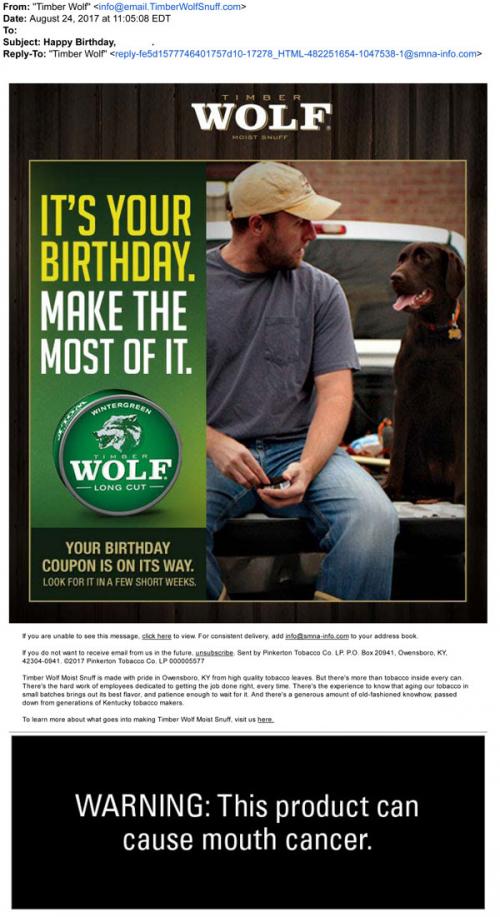 Birthday email from Timber Wolf in August 2017 letting the recipient know that a special celebratory coupon is in the mail. Text: "It's your birthday. Make the most of it."
