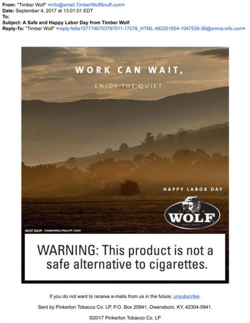 Email from Timber Wolf in September 2017 wishing the recipient a happy Labor Day, saying "Work can wait, enjoy the quiet." Shows an image of a misty hillside.