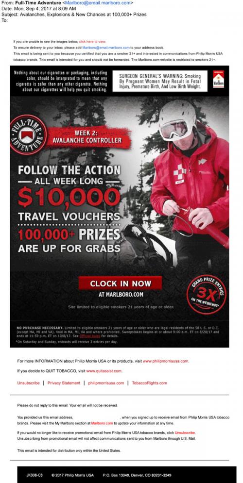 Email from Marlboro in September 2017 promoting the Full Time Adventure sweepstakes, with a link to the brand website to enter.