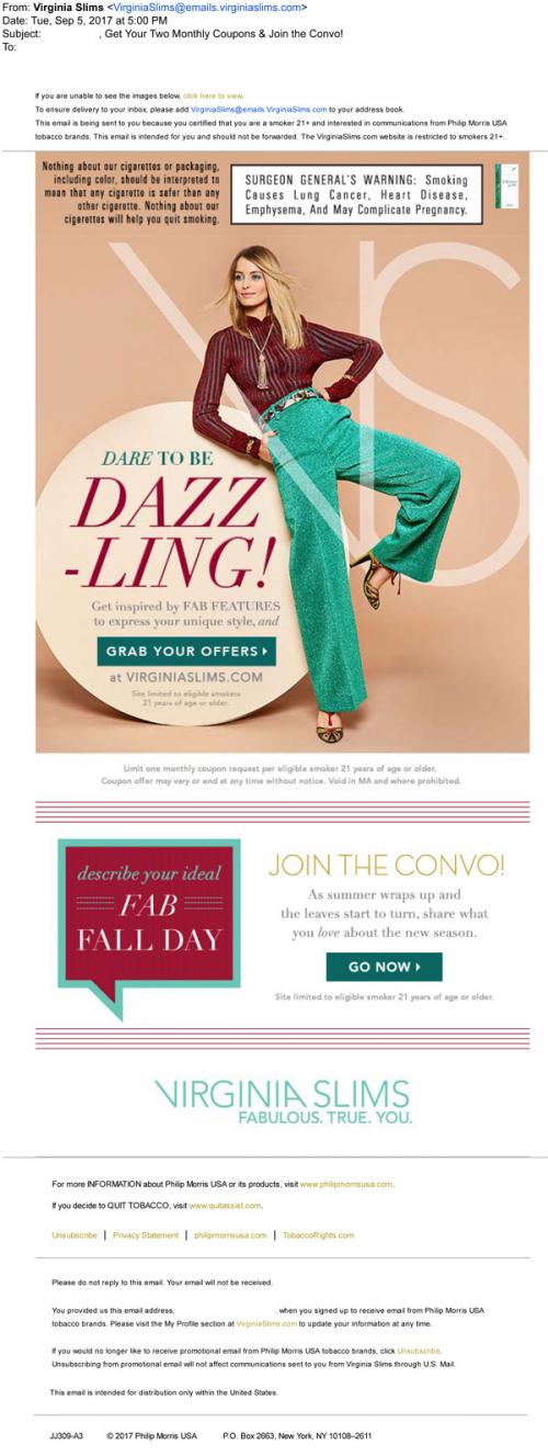 Virginia Slims email from September 2017 promoting the monthly coupons available through the brand website. Also invites the recipient to join in the conversation about the new fall season.