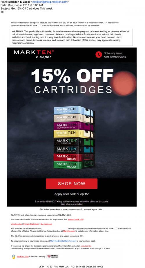 MarkTen email from September 2017 announcing a sale on cartridges through the online store. Links to the brand website to purchase and includes a discount code. Image features the entire flavor lineup for the brand.