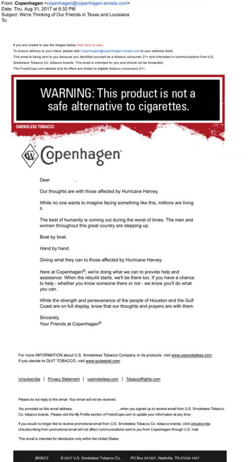 Email from Copenhagen in August 2017 expressing condolences for those affected by Hurricane Harvey. The brand makes a vague promise instead of a concrete show of support, saying, "we're doing what we can to provide help and assistance. When the rebuild starts, we'll be there too."